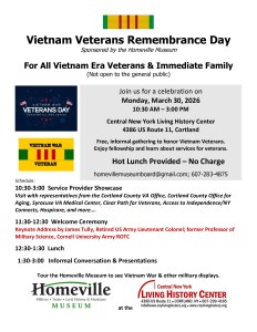 The Homeville Museum is part of the Central New York Living History Center located at 4386 US Route 11, Cortland, N.Y. 13045. It appeals to people of all ages and engages the community in understanding historical experiences and their relationship to past and contemporary life. Through public activities and events, the museum’s displays are brought to life through educational presentations, reenactments, discussions, and artistic demonstrations. Core collections relate to military history, local business, industry, and railroad history.