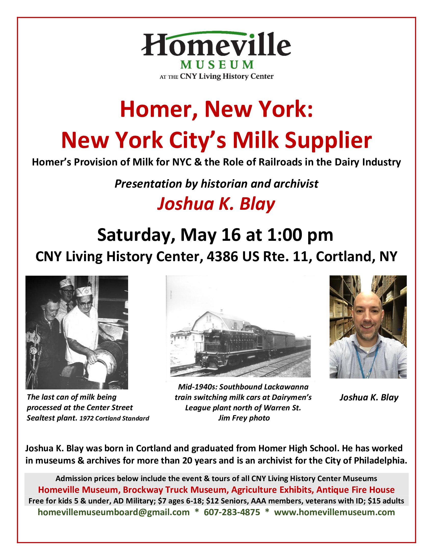 May 16, 1:00 pm: Joshua Blay, “Homer, New York: New York City’s Milk Supplier”