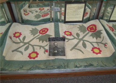 The collection also includes a Civil-War era quilt that was confiscated from a Confederate home in Columbia, SC by Captain Harrison Marvin of Dryden, NY while on the March from Atlanta to the Sea and on north through the Carolinas with General Sherman’s Army. Captain Marvin was mustered into service on Oct. 8, 1862, and was in command of Company I, 143rd Infantry. He saw action in such battles as Lookout Mountain, Chattanooga, Kennesaw Mountain, Culpepper Farm, Atlanta, and Savannah. His niece, Mrs. Amos Rolfe, donated this quilt to Ken Eaton’s collection in 1962.