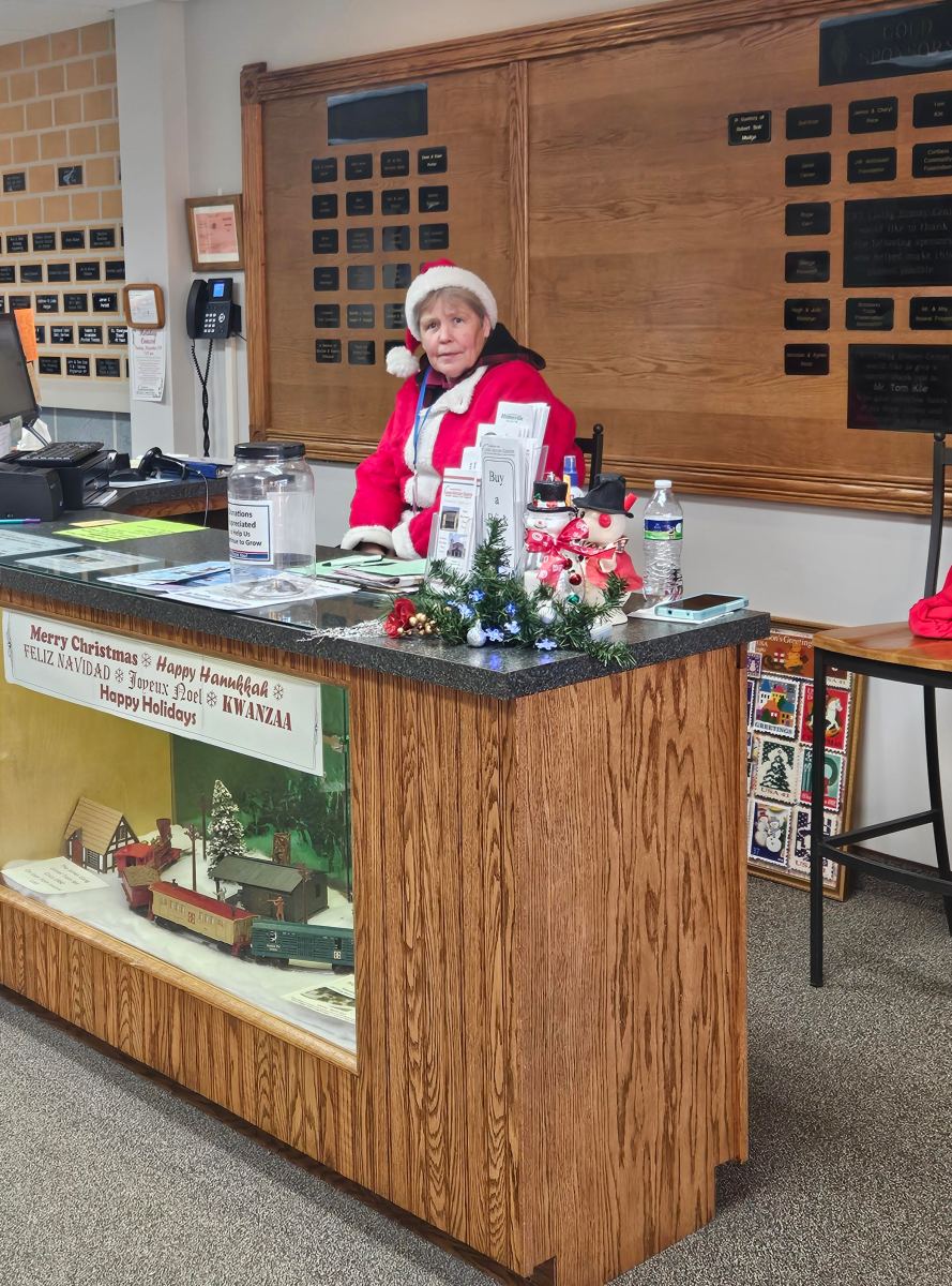 Jean_TrainDay2024_frontdesk Published December 16, 2024 at 2362 × 3189 Jean Edwards greeting visitors